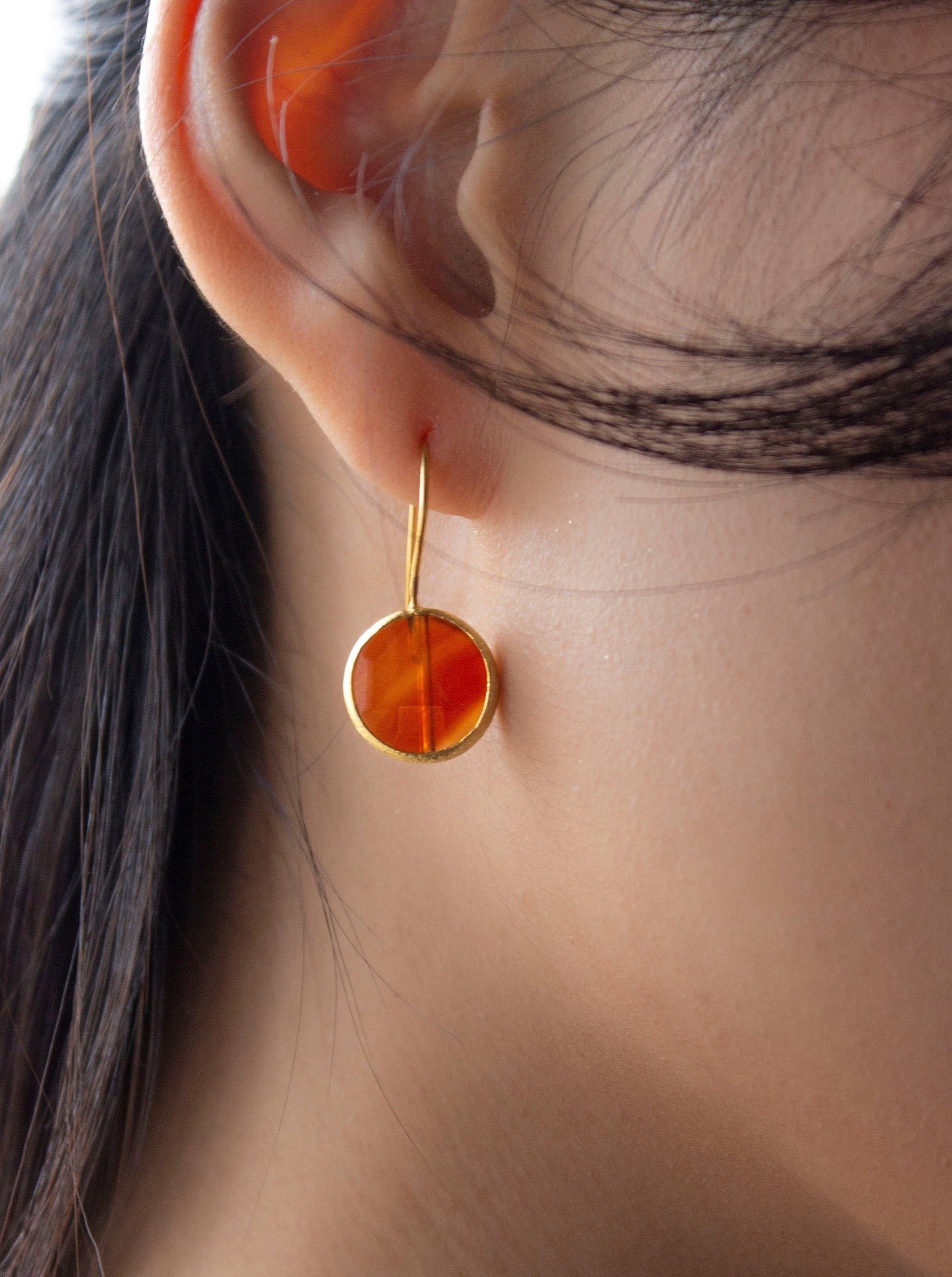 These agate earrings are the perfect way to bring a touch of nature with you wherever you go. The delicate gold frame surrounds a high-quality orange-brown agate stone, making these a must-have accessory for any outfit. Whether you're dressing up or keeping it casual, these earrings add an air of sophistication and elegance. They pair up perfectly with the Leda necklace as well.