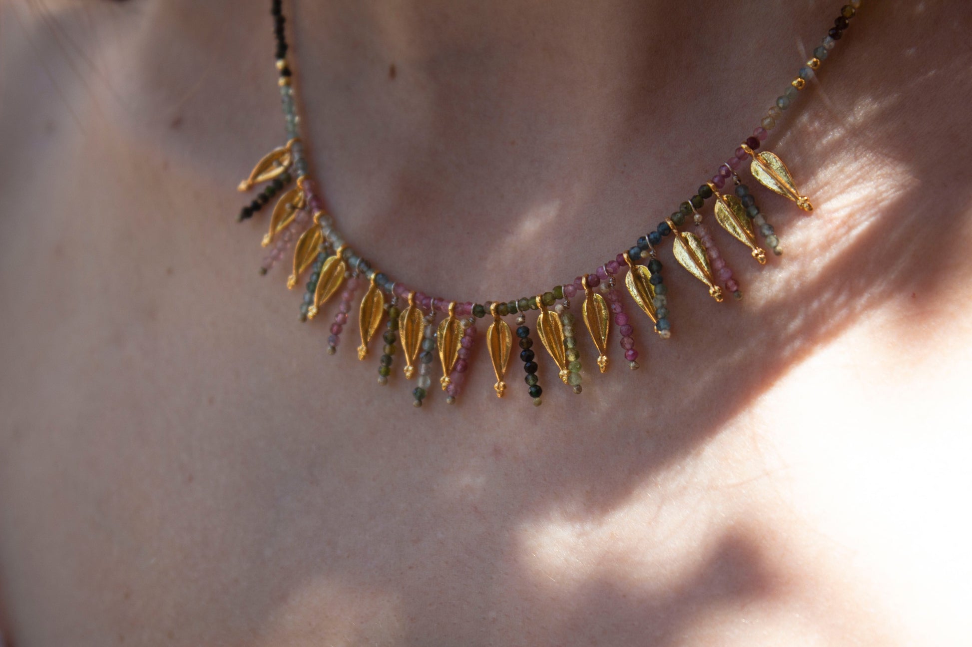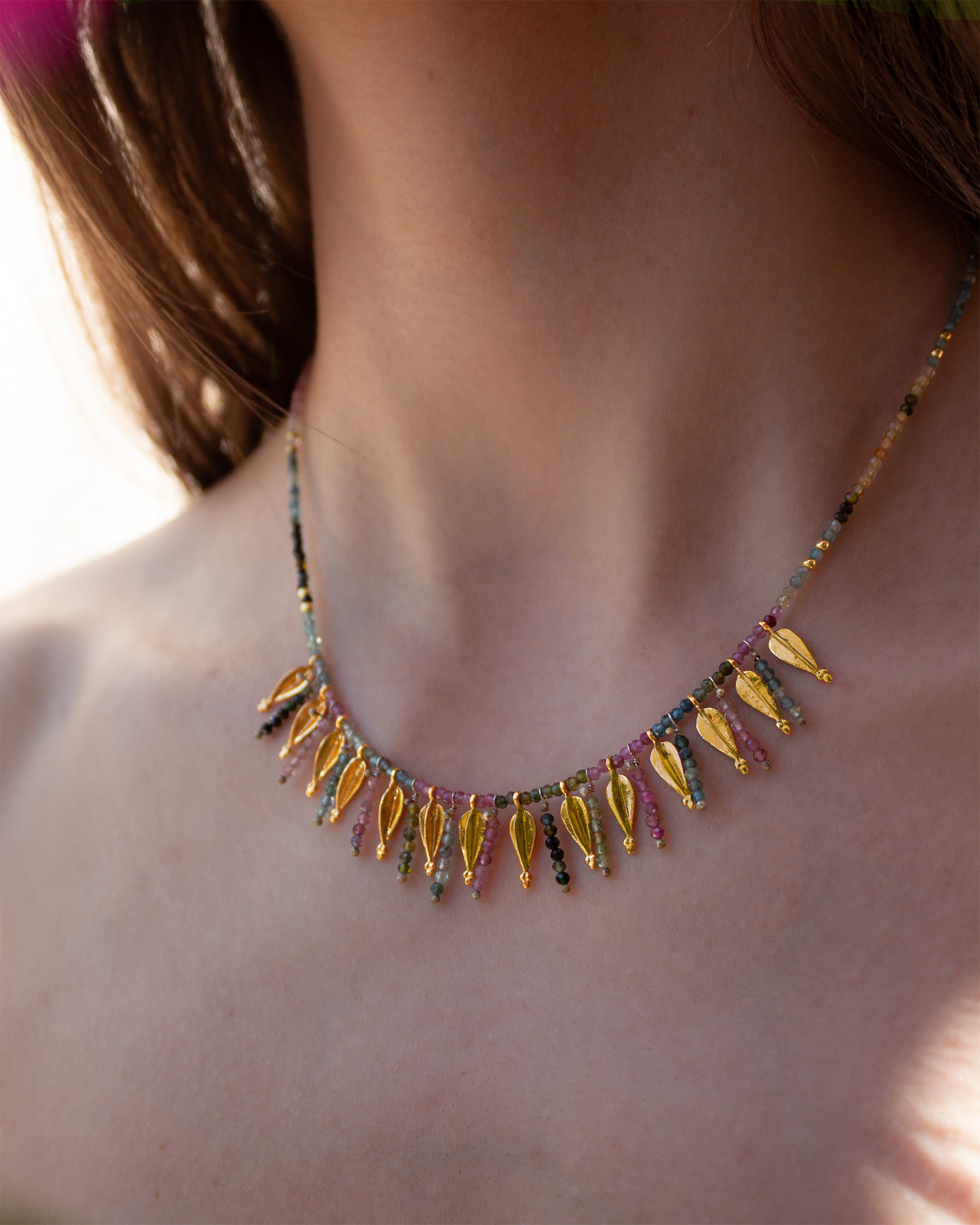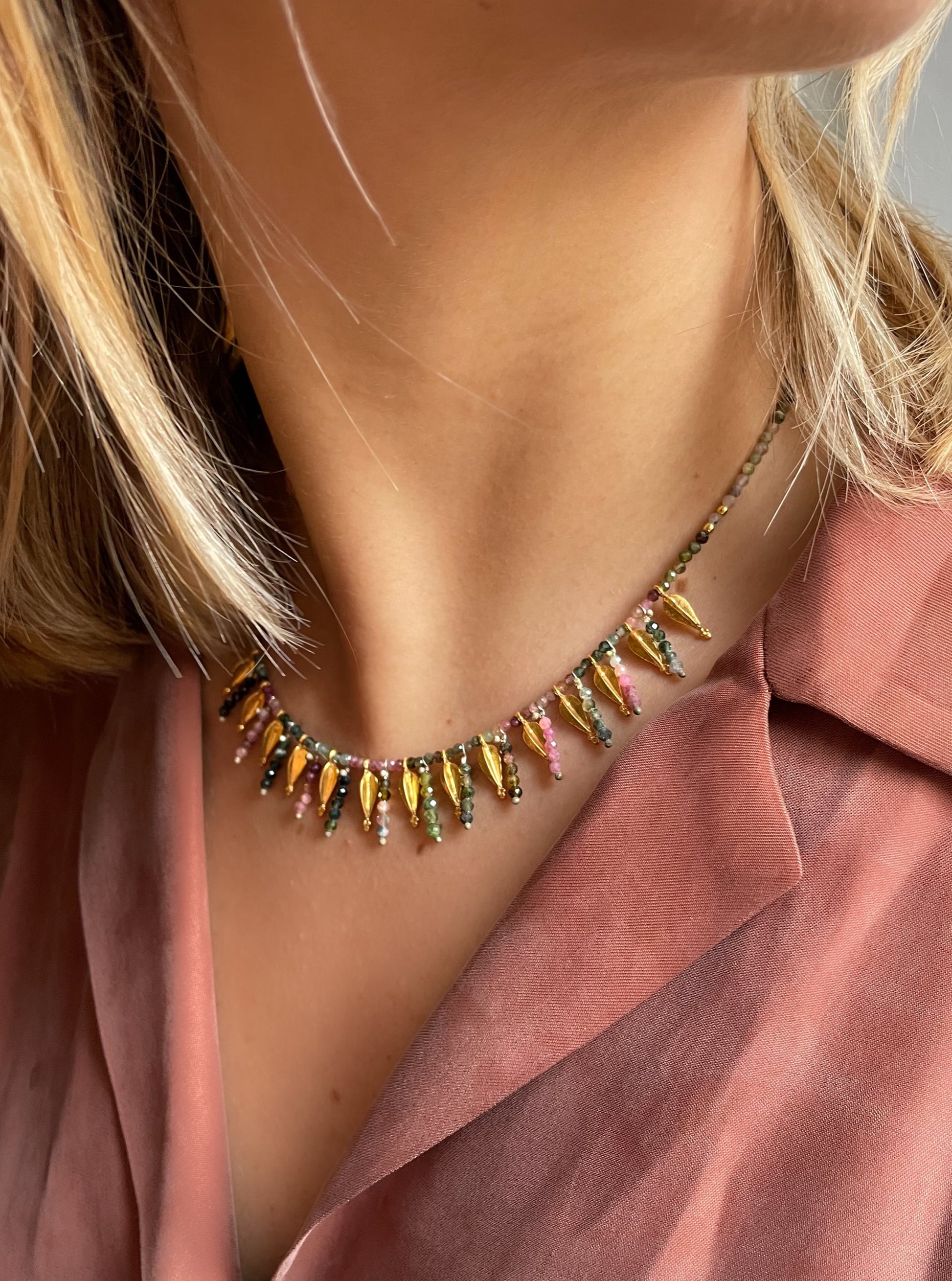 Introducing Flora: the goddess of flowers and spring. This necklace has harmoniously put together with spring-like colored tourmalines and miniature spearheads. The result is a beautiful, one-of-a-kind piece that's just perfect for showing off your natural beauty.