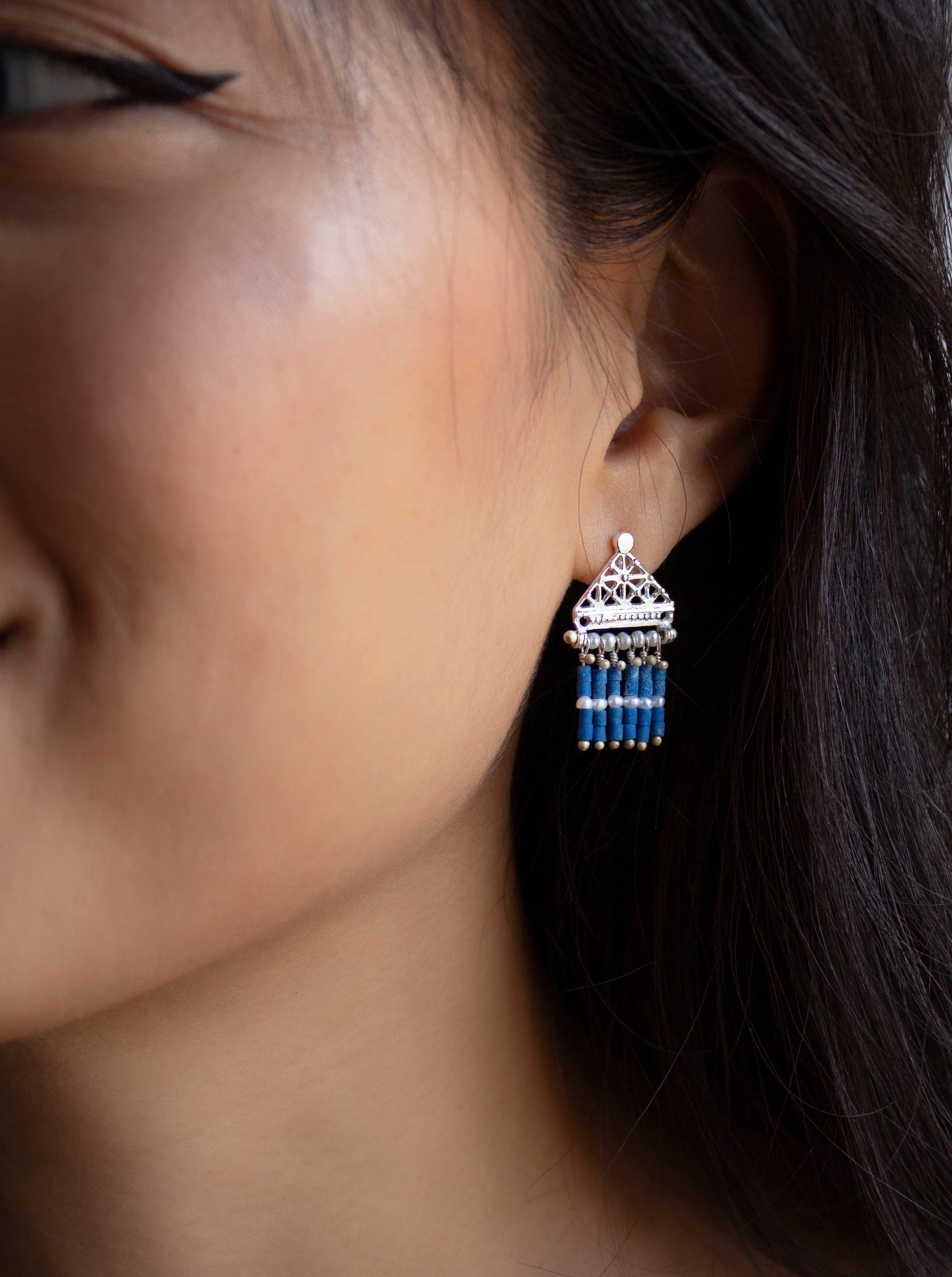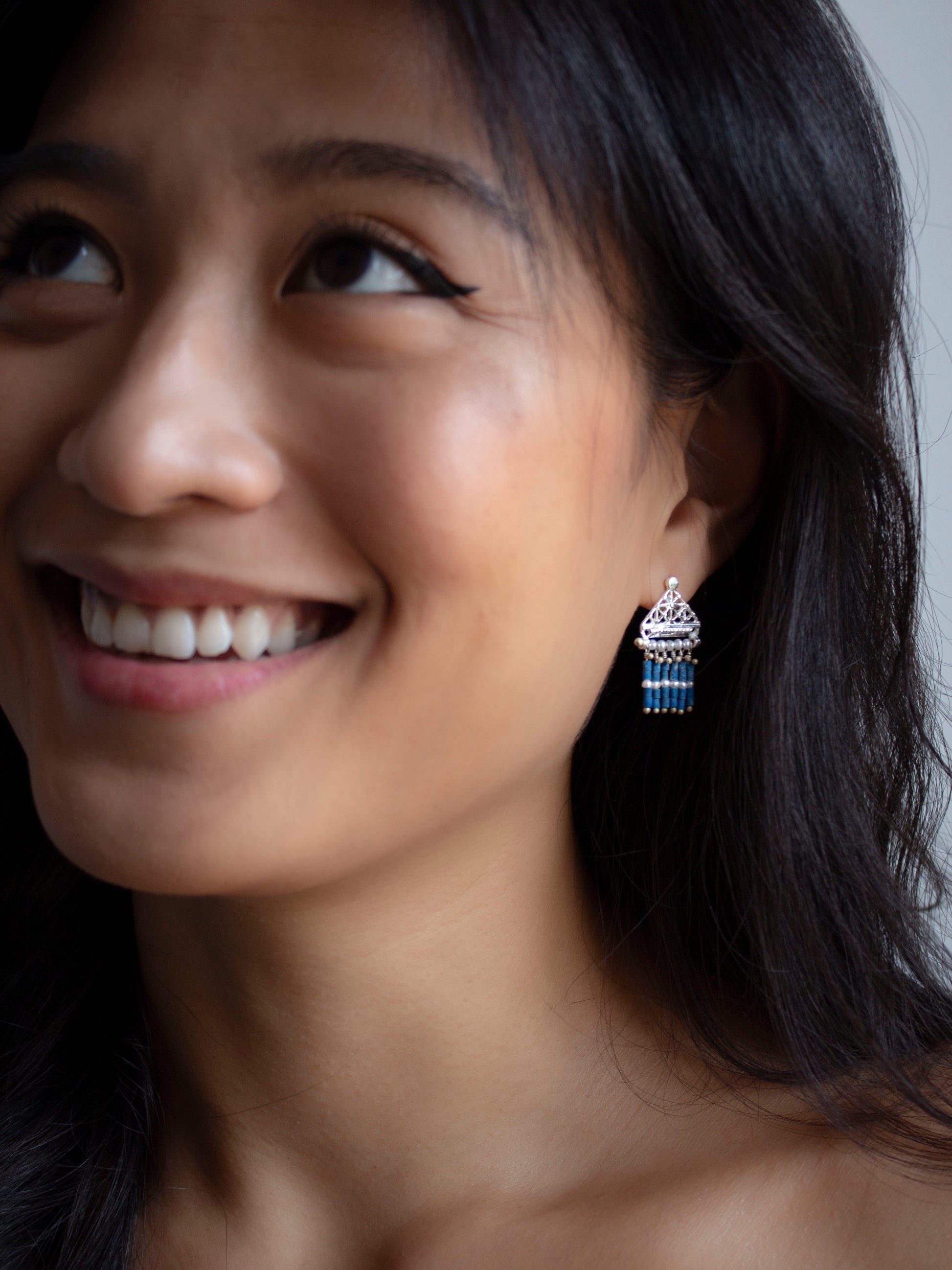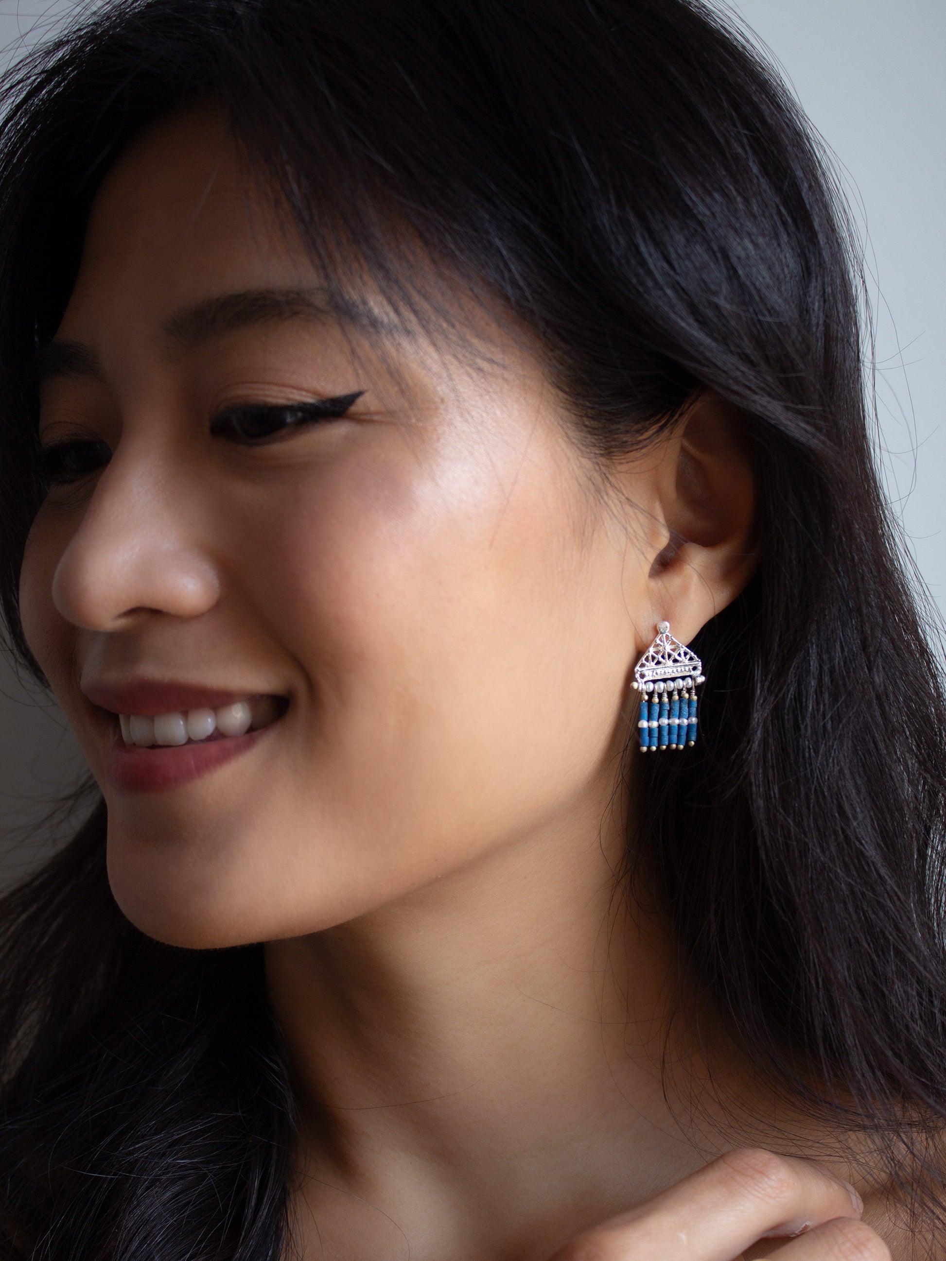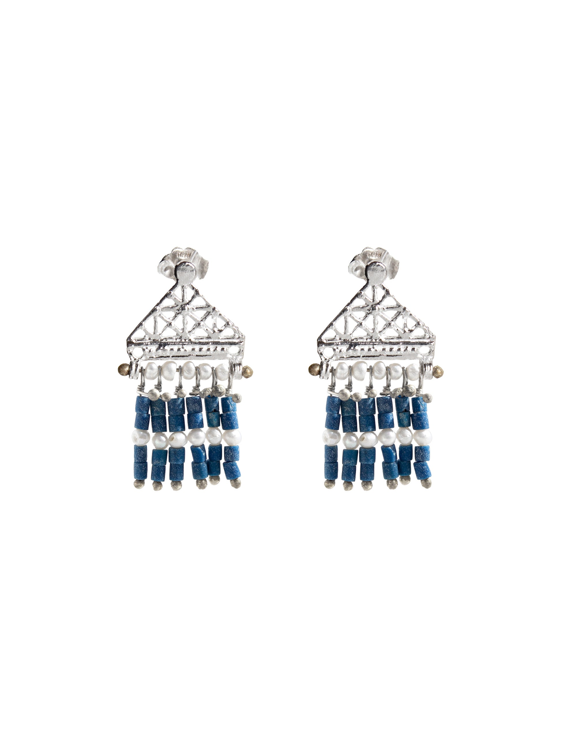 These silver lapis lazuli earrings are a work of art, the perfect mix of modern and ancient styles. The harmonious play of pearls and lapis lazuli stones feels like the sparkles of the sun over the sea. What really makes these earrings unique is the binding element, a triangular cut from the Hittite sun disk. The circular symbol, taking its form from the earth and the sun, was used for their religious rites for fertility and freedom.