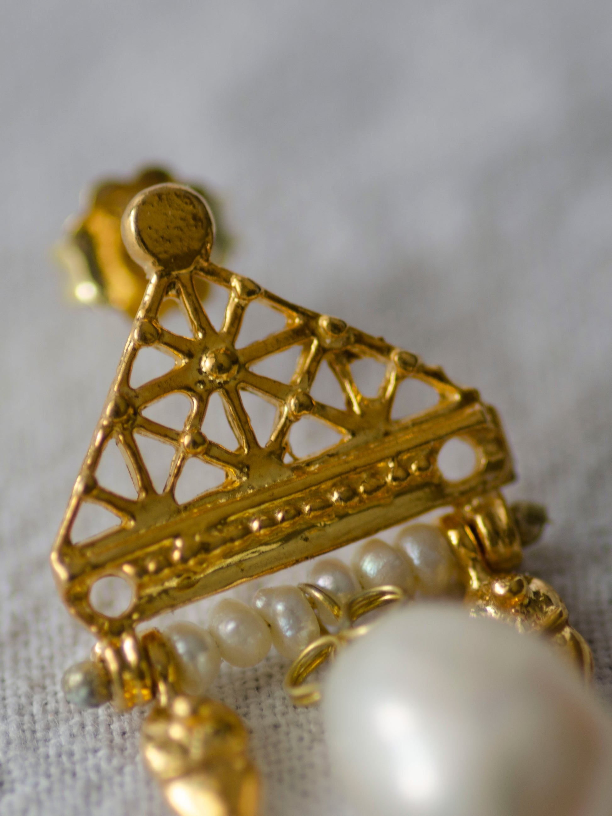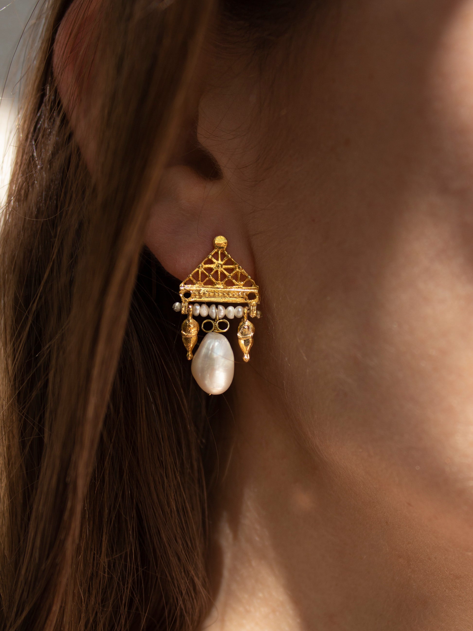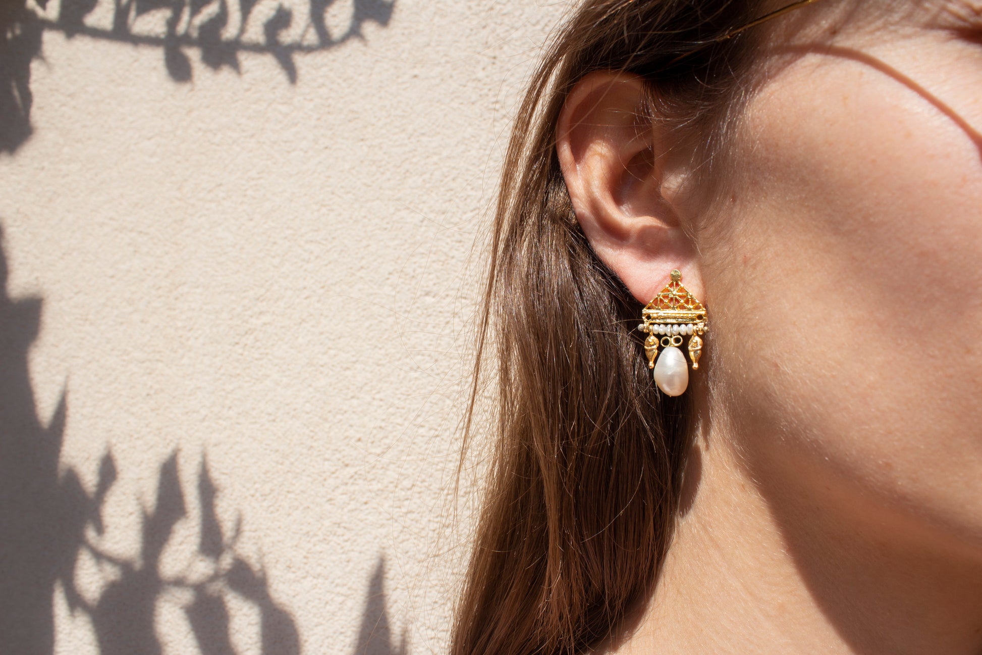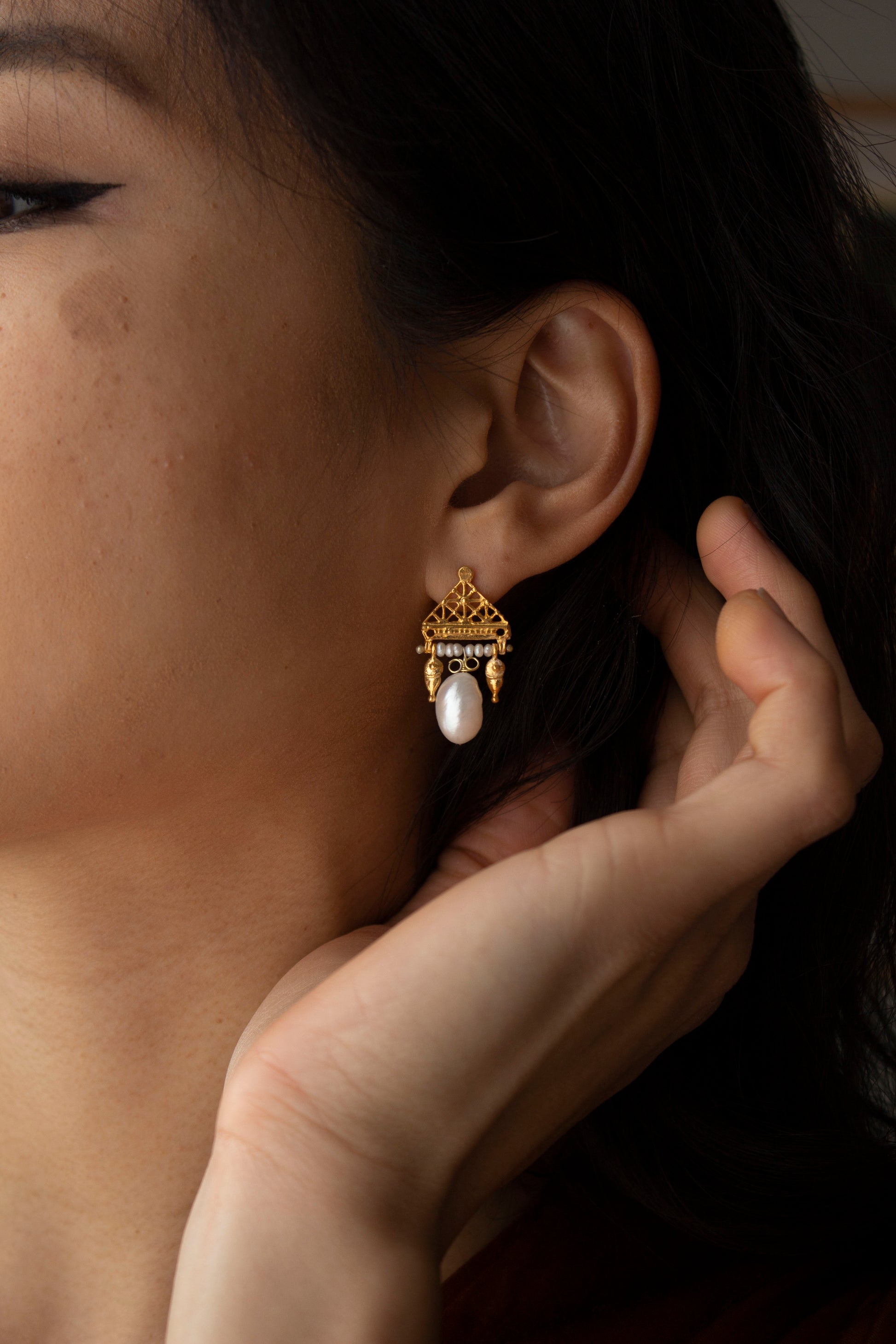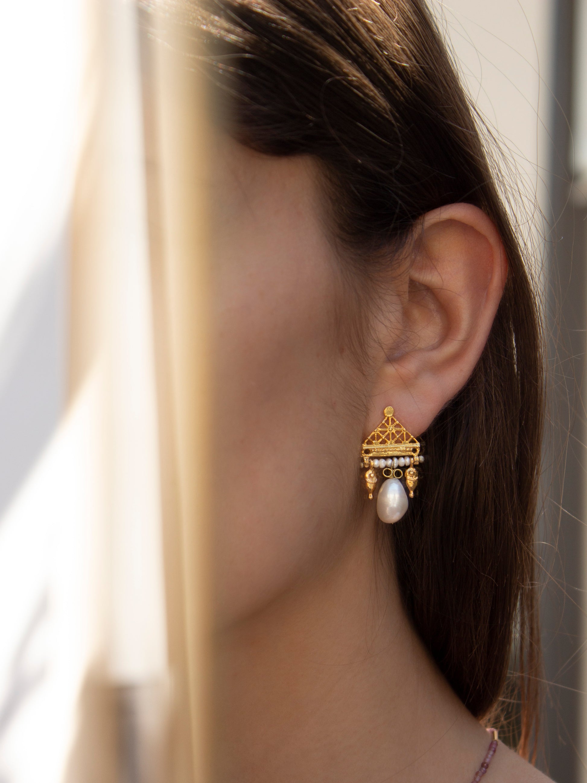 The triangular geometry of the Hittite sun symbol and a hanging pearl merge to create an intricate yet eye-catching design that can easily go from day to night. The Golden Sun motif provides a brilliant contrast against the softness of the pearl and two fish emblems. The Fish symbols are believed to bring luck and prosperity, along with the pearl, symbolizing wisdom gained through life experiences. These earrings are sure to be conversation starters that will give you an edge over any ensemble!