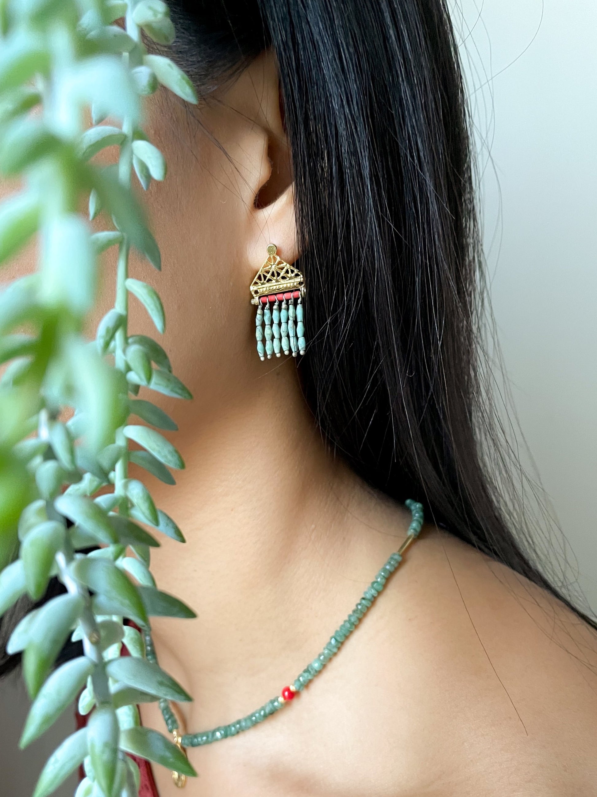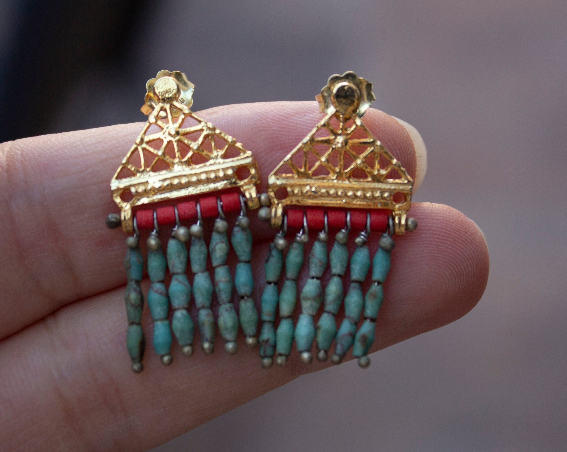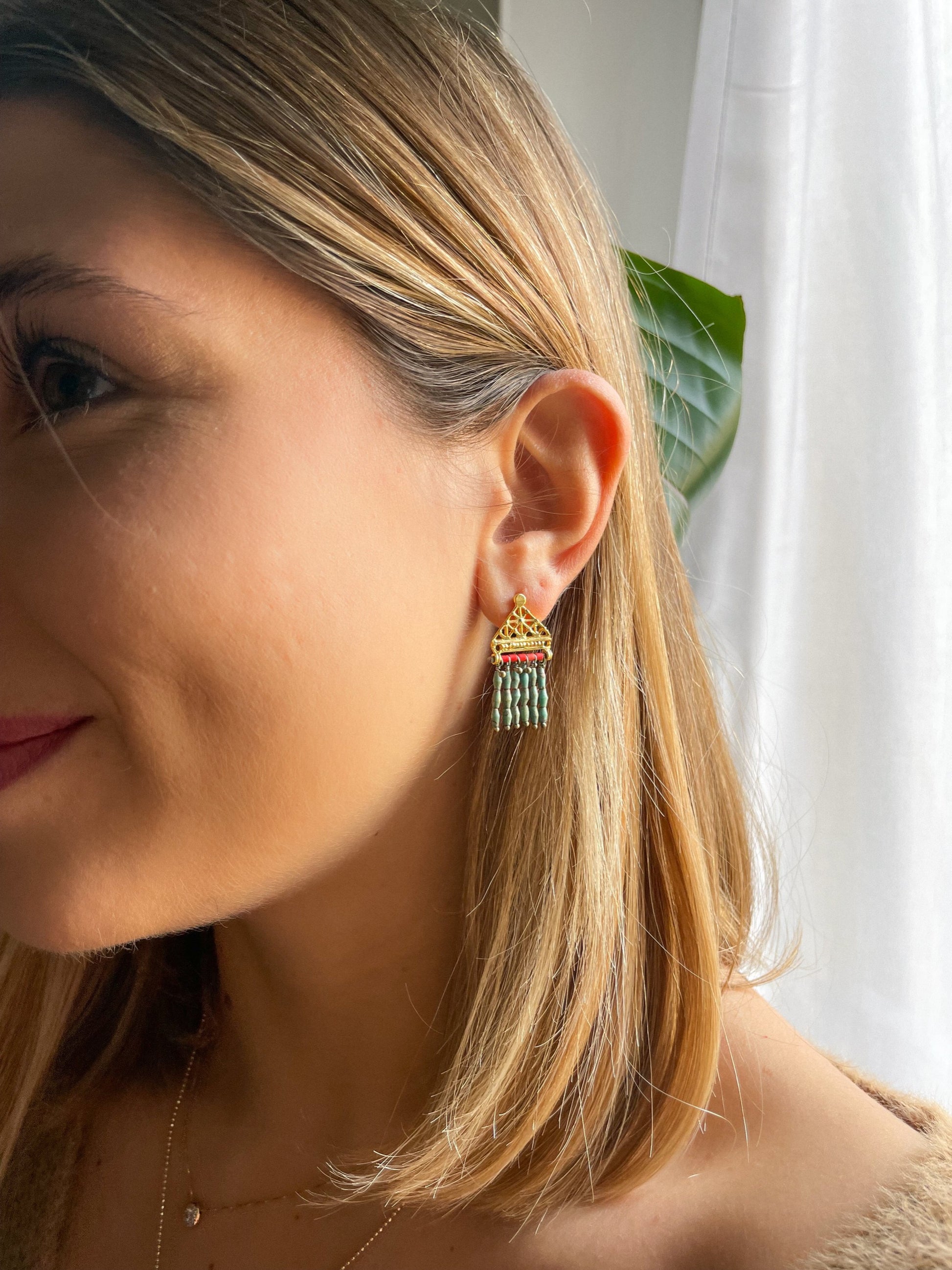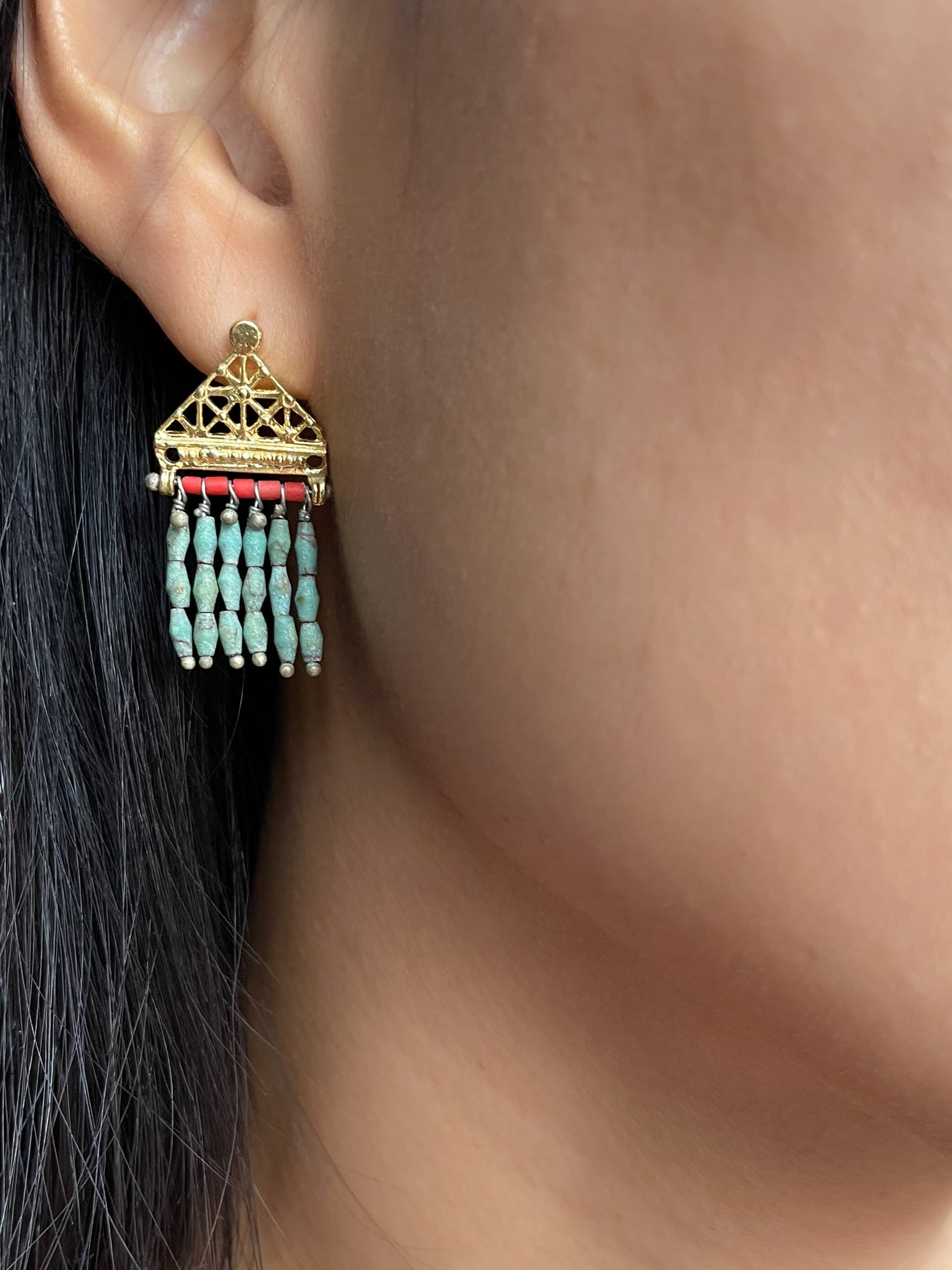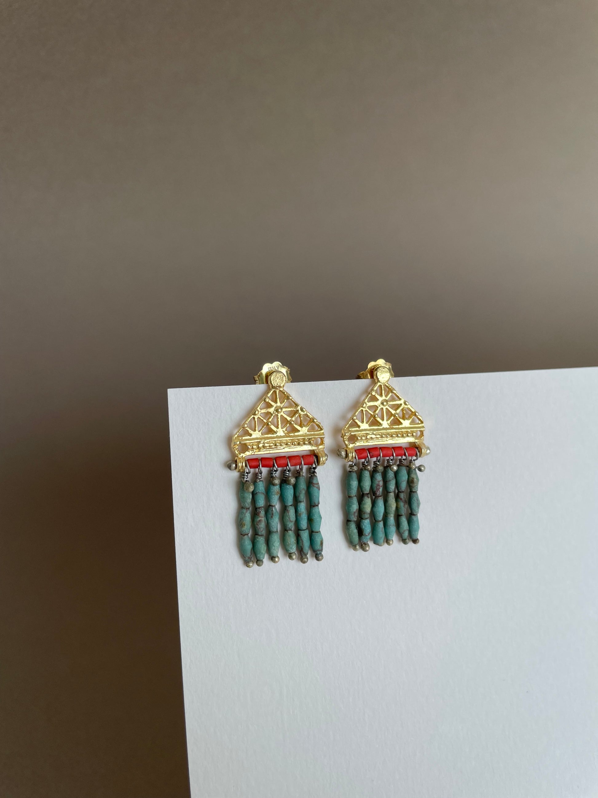 These gold earrings are a work of art- the perfect mix of modern and ancient styles. The turquoise stones create an ivy-like pattern, while the coral provides a bright pop of color. But what really makes these earrings special is the binding element- a partial Hittite sun disk. These elegant earrings are perfect for adding a touch of femininity and color to any outfit.