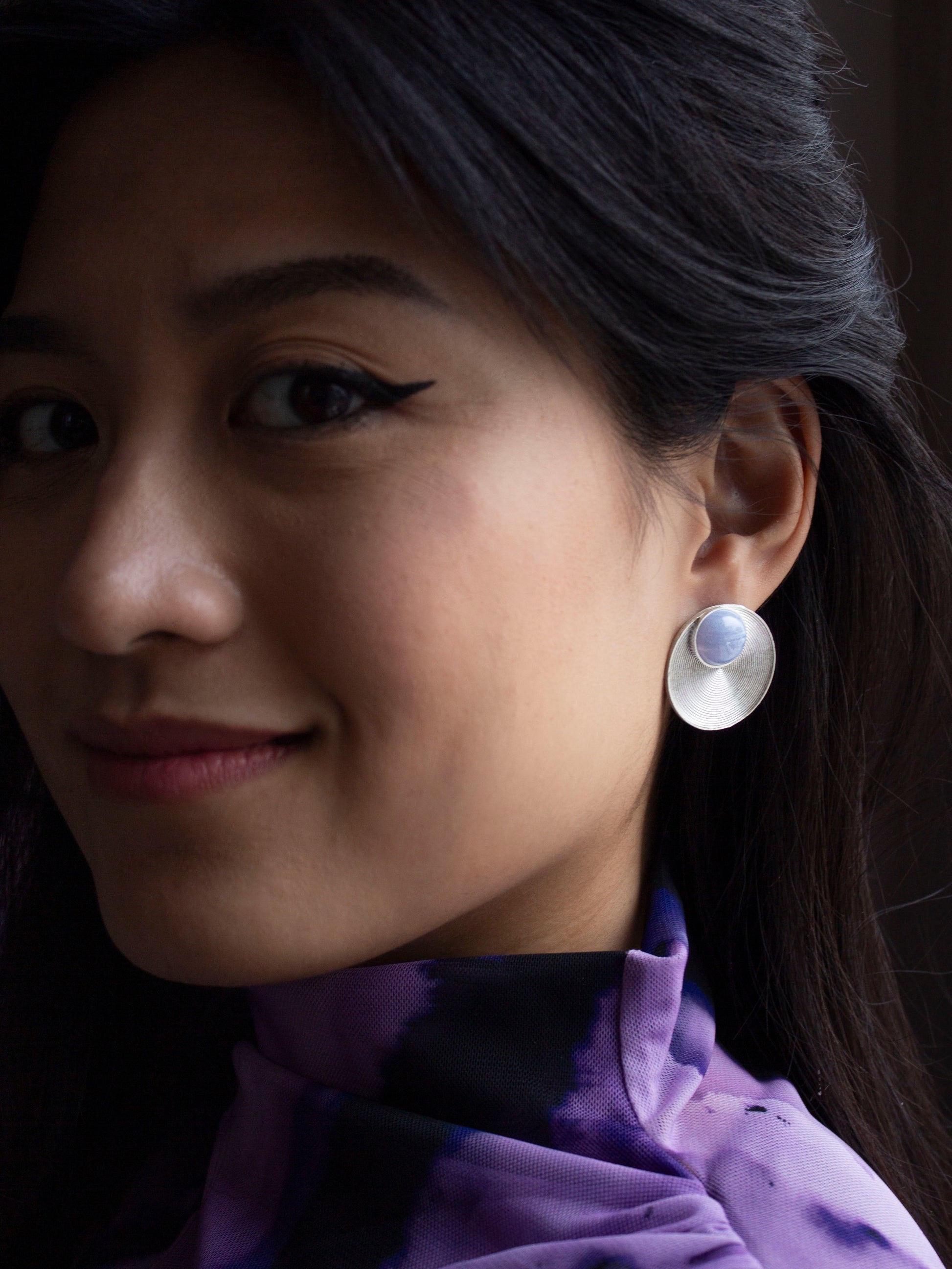 The silver earrings feature a round calcedony with spiral pattern, just like the other pieces from the Luna Collection, celebrating the symbol of change and creativity, through the radience feminen energy of the moon.
