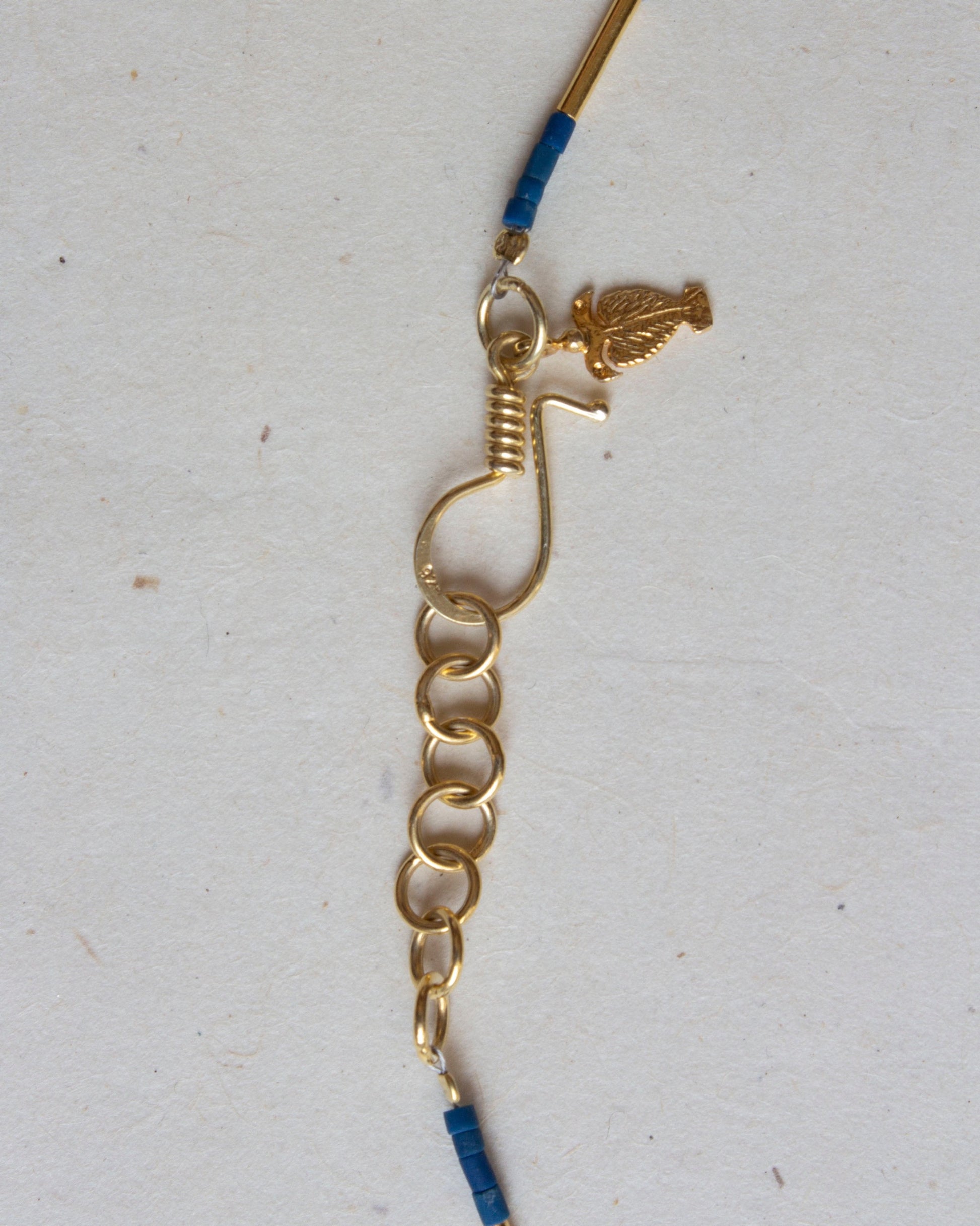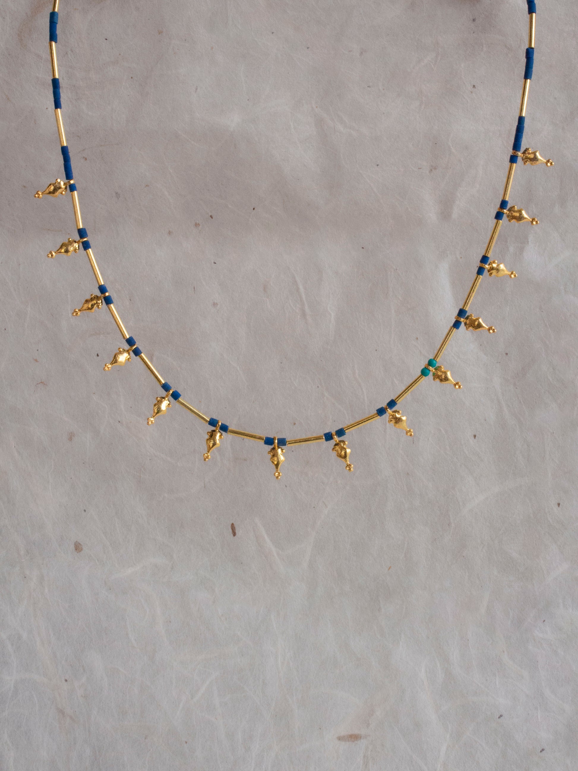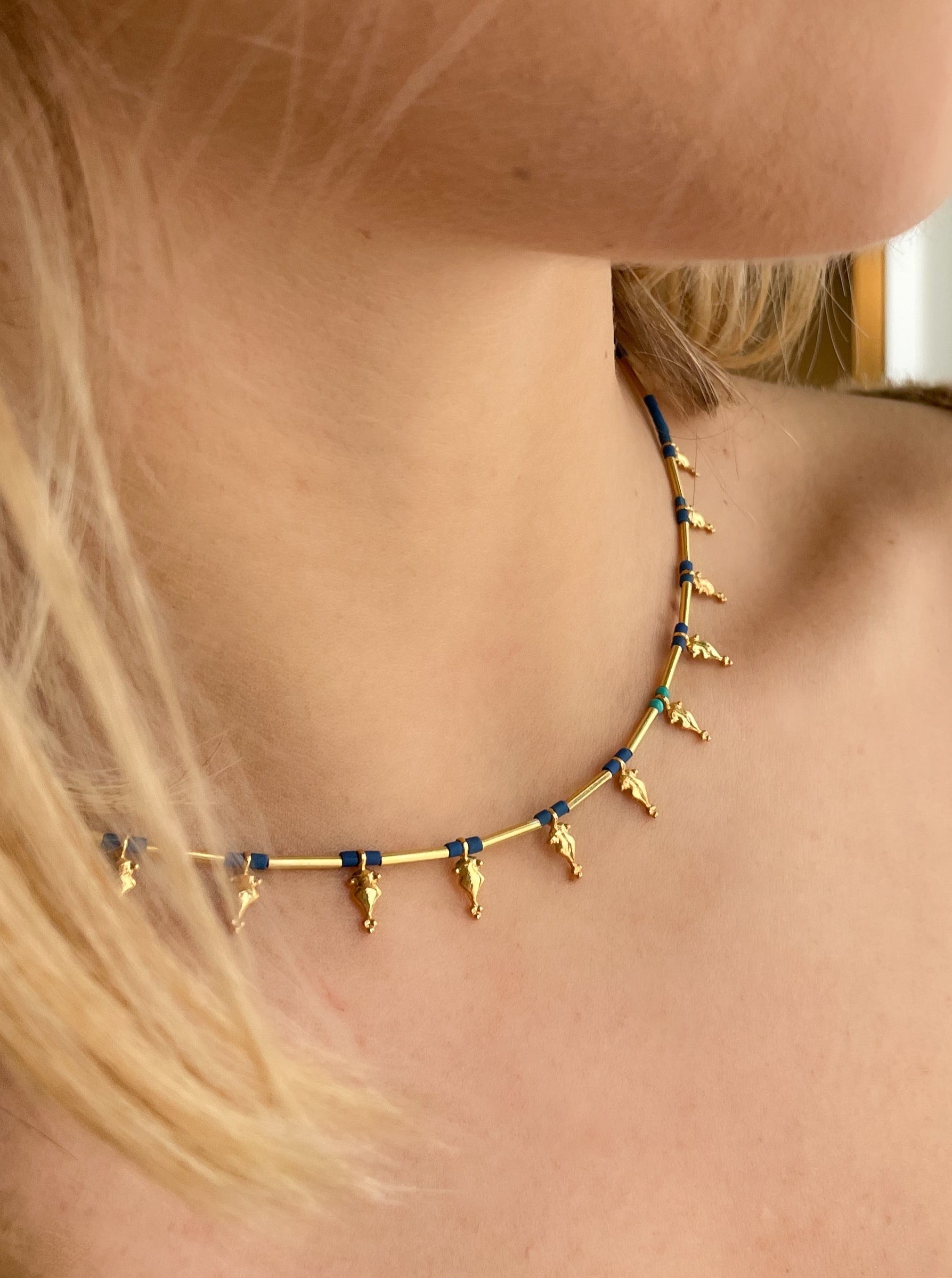 This stunning piece is inspired by the legacy of Tyche, the goddess of fortune and luck. She is known for bringing success despite adversity and good fortune during hard times. The necklace has three elements combined to help your dreams come true: The spears to call on your inner fighter, calming Lapis lazuli and clarifying Turquoise gemstones.